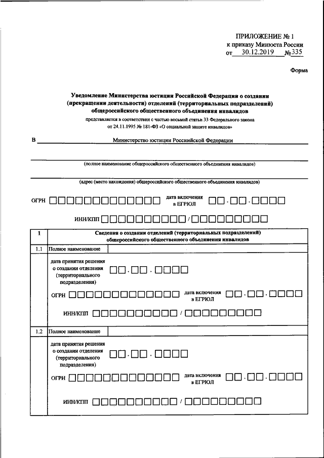"ОБ УТВЕРЖДЕНИИ ФОРМЫ И ПОРЯДКА УВЕДОМЛЕНИЯ МИНИСТЕРСТВА ЮСТИЦИИ РОССИЙСКОЙ ФЕДЕРАЦИИ О СОЗДАНИИ (ПРЕКРАЩЕНИИ ДЕЯТЕЛЬНОСТИ) ОТДЕЛЕНИЙ (ТЕРРИТОРИАЛЬНЫХ ПОДРАЗДЕЛЕНИЙ) ОБЩЕРОССИЙСКИХ ОБЩЕСТВЕННЫХ ОБЪЕДИНЕНИЙ ИНВАЛИДОВ, УКАЗАННЫХ В ЧАСТИ СЕДЬМОЙ СТАТЬИ 33 ФЕДЕРАЛЬНОГО ЗАКОНА ОТ 24.11.1995 N 181-ФЗ "О СОЦИАЛЬНОЙ ЗАЩИТЕ ИНВАЛИДОВ В РОССИЙСКОЙ ФЕДЕРАЦИИ"