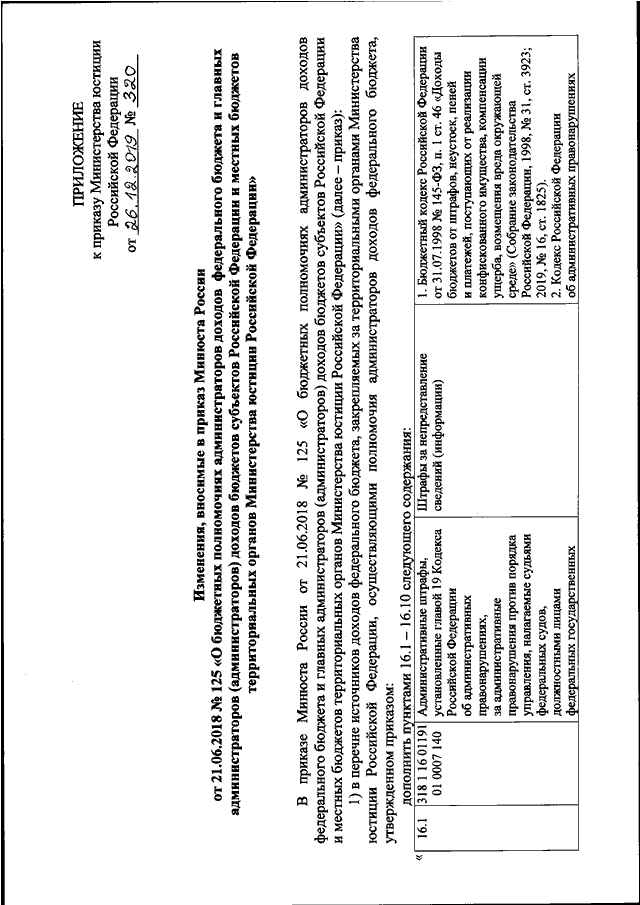 "О ВНЕСЕНИИ ИЗМЕНЕНИЙ В ПРИКАЗ МИНЮСТА РОССИИ ОТ 21.06.2018 N 125 "О БЮДЖЕТНЫХ ПОЛНОМОЧИЯХ АДМИНИСТРАТОРОВ ДОХОДОВ ФЕДЕРАЛЬНОГО БЮДЖЕТА И ГЛАВНЫХ АДМИНИСТРАТОРОВ (АДМИНИСТРАТОРОВ) ДОХОДОВ БЮДЖЕТОВ СУБЪЕКТОВ РОССИЙСКОЙ ФЕДЕРАЦИИ И МЕСТНЫХ БЮДЖЕТОВ ТЕРРИТОРИАЛЬНЫХ ОРГАНОВ МИНИСТЕРСТВА ЮСТИЦИИ РОССИЙСКОЙ ФЕДЕРАЦИИ"