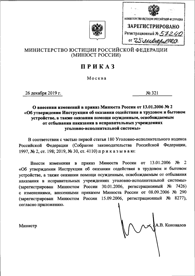 ПРИКАЗ Минюста РФ от 26.12.2019 N 321