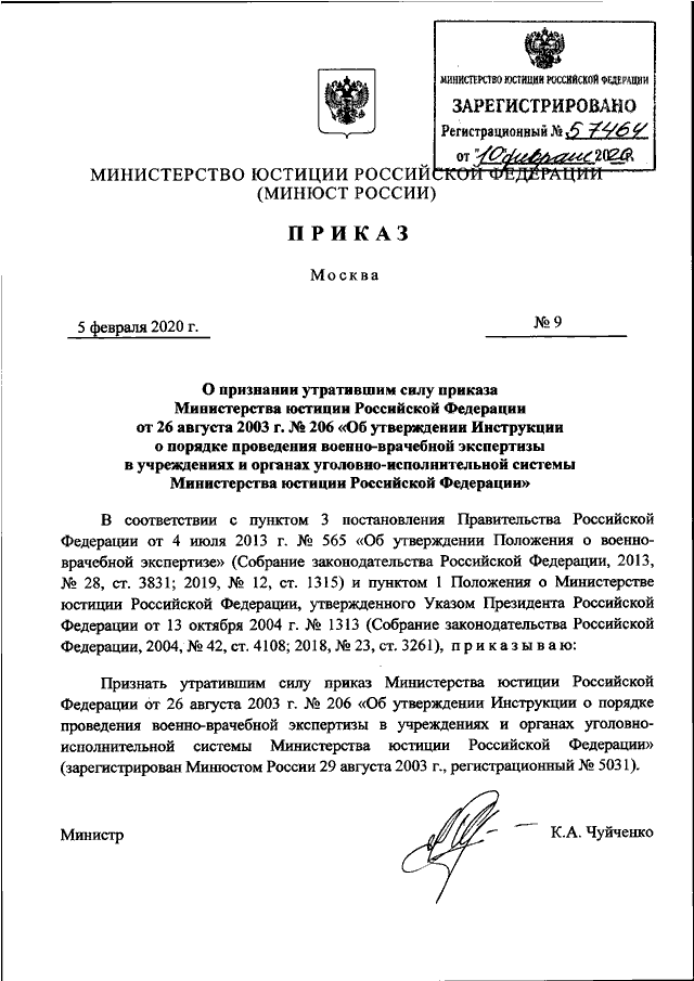 ПРИКАЗ Минюста РФ от 05.02.2020 N 9