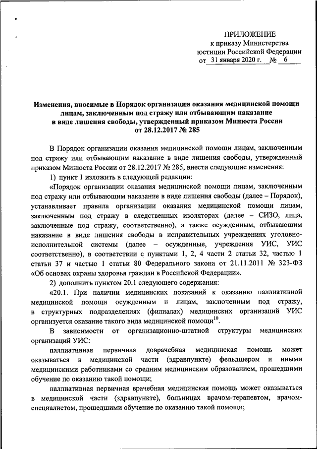 "О ВНЕСЕНИИ ИЗМЕНЕНИЙ В ПОРЯДОК ОРГАНИЗАЦИИ ОКАЗАНИЯ МЕДИЦИНСКОЙ ПОМОЩИ ЛИЦАМ, ЗАКЛЮЧЕННЫМ ПОД СТРАЖУ ИЛИ ОТБЫВАЮЩИМ НАКАЗАНИЕ В ВИДЕ ЛИШЕНИЯ СВОБОДЫ, УТВЕРЖДЕННЫЙ ПРИКАЗОМ МИНЮСТА РОССИИ ОТ 28.12.2017 N 285"