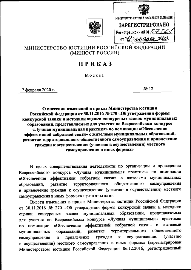 ПРИКАЗ Минюста РФ от 07.02.2020 N 12