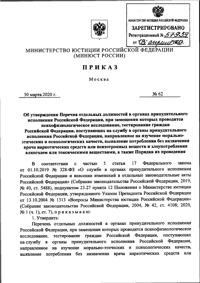 ПРИКАЗ Минюста РФ от 30.03.2020 N 62