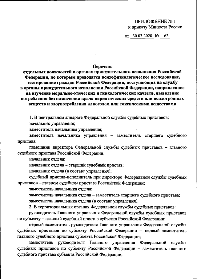 "ОБ УТВЕРЖДЕНИИ ПЕРЕЧНЯ ОТДЕЛЬНЫХ ДОЛЖНОСТЕЙ В ОРГАНАХ ПРИНУДИТЕЛЬНОГО ИСПОЛНЕНИЯ РОССИЙСКОЙ ФЕДЕРАЦИИ, ПРИ ЗАМЕЩЕНИИ КОТОРЫХ ПРОВОДЯТСЯ ПСИХОФИЗИОЛОГИЧЕСКОЕ ИССЛЕДОВАНИЕ, ТЕСТИРОВАНИЕ ГРАЖДАН РОССИЙСКОЙ ФЕДЕРАЦИИ, ПОСТУПАЮЩИХ НА СЛУЖБУ В ОРГАНЫ ПРИНУДИТЕЛЬНОГО ИСПОЛНЕНИЯ РОССИЙСКОЙ ФЕДЕРАЦИИ, НАПРАВЛЕННОЕ НА ИЗУЧЕНИЕ МОРАЛЬНО - ЭТИЧЕСКИХ И ПСИХОЛОГИЧЕСКИХ КАЧЕСТВ, ВЫЯВЛЕНИЕ ПОТРЕБЛЕНИЯ БЕЗ НАЗНАЧЕНИЯ ВРАЧА НАРКОТИЧЕСКИХ СРЕДСТВ ИЛИ ПСИХОТРОПНЫХ ВЕЩЕСТВ И ЗЛОУПОТРЕБЛЕНИЯ АЛКОГОЛЕМ ИЛИ ТОКСИЧЕСКИМИ ВЕЩЕСТВАМИ, А ТАКЖЕ ПОРЯДКА ИХ ПРОВЕДЕНИЯ"