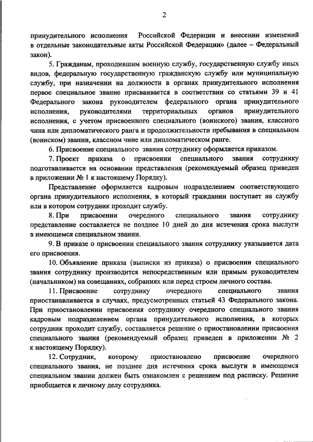 "ОБ УТВЕРЖДЕНИИ ПОРЯДКА ПРИСВОЕНИЯ СОТРУДНИКАМ ОРГАНОВ ПРИНУДИТЕЛЬНОГО ИСПОЛНЕНИЯ РОССИЙСКОЙ ФЕДЕРАЦИИ ОЧЕРЕДНЫХ СПЕЦИАЛЬНЫХ ЗВАНИЙ, СООТВЕТСТВУЮЩИХ ДОЛЖНОСТЯМ СРЕДНЕГО И СТАРШЕГО НАЧАЛЬСТВУЮЩЕГО СОСТАВА, ДО ПОДПОЛКОВНИКА ВНУТРЕННЕЙ СЛУЖБЫ ВКЛЮЧИТЕЛЬНО, А ТАКЖЕ ПЕРВЫХ И ОЧЕРЕДНЫХ СПЕЦИАЛЬНЫХ ЗВАНИЙ, СООТВЕТСТВУЮЩИХ ДОЛЖНОСТЯМ МЛАДШЕГО НАЧАЛЬСТВУЮЩЕГО СОСТАВА"