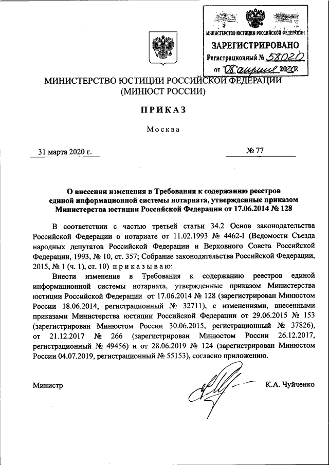 ПРИКАЗ Минюста РФ от 31.03.2020 N 77