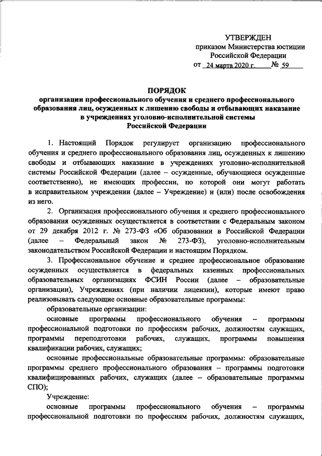 ПРИКАЗ Минюста РФ от 24.03.2020 N 59