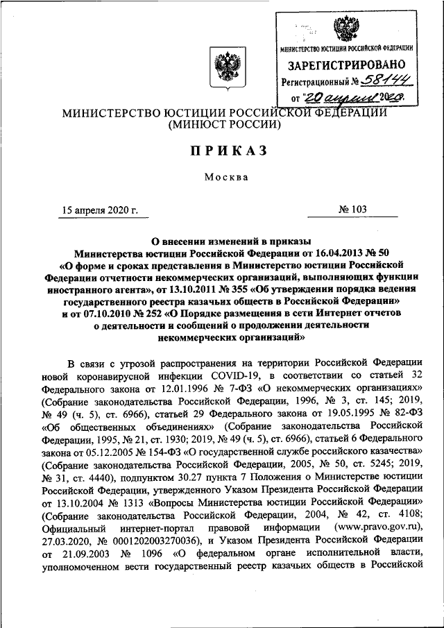 ПРИКАЗ Минюста РФ от 15.04.2020 N 103