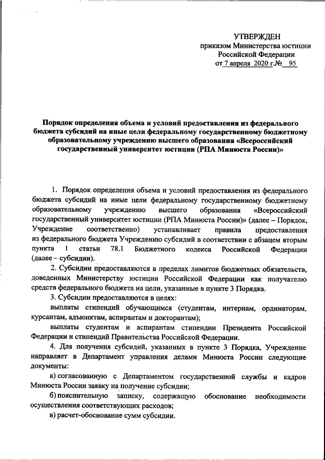 ПРИКАЗ Минюста РФ от 07.04.2020 N 95