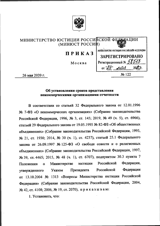 ПРИКАЗ Минюста РФ от 26.05.2020 N 122