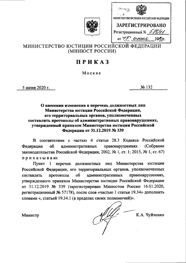 ПРИКАЗ Минюста РФ от 05.06.2020 N 132