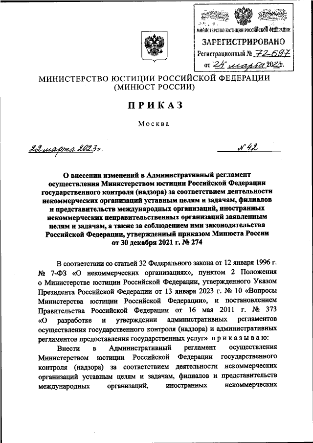 ПРИКАЗ Минюста РФ от 22.03.2023 N 42