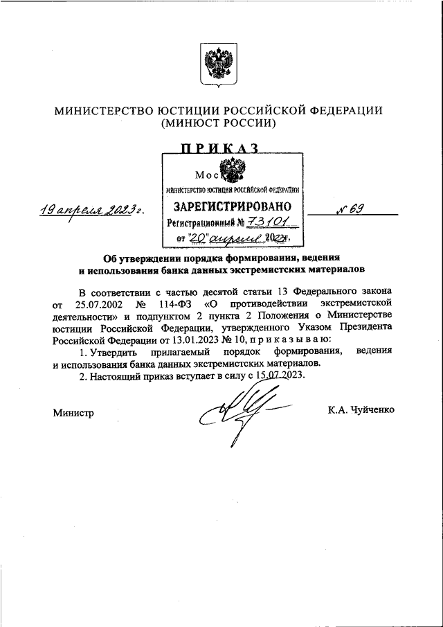 ПРИКАЗ Минюста РФ от 19.04.2023 N 69