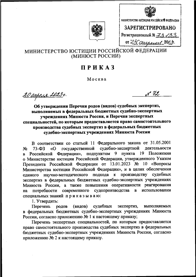 ПРИКАЗ Минюста РФ от 20.04.2023 N 72