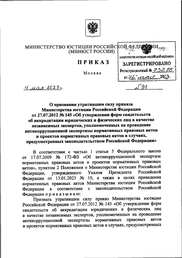ПРИКАЗ Минюста РФ от 04.05.2023 N 91