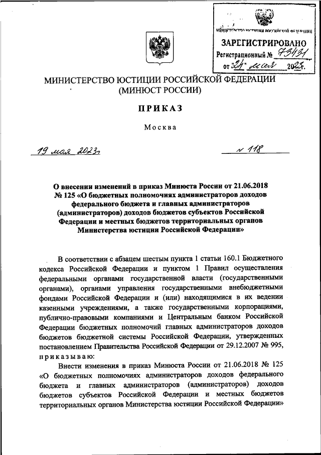 "О ВНЕСЕНИИ ИЗМЕНЕНИЙ В ПРИКАЗ МИНЮСТА РОССИИ ОТ 21.06.2018 N 125 "О БЮДЖЕТНЫХ ПОЛНОМОЧИЯХ АДМИНИСТРАТОРОВ ДОХОДОВ ФЕДЕРАЛЬНОГО БЮДЖЕТА И ГЛАВНЫХ АДМИНИСТРАТОРОВ (АДМИНИСТРАТОРОВ) ДОХОДОВ БЮДЖЕТОВ СУБЪЕКТОВ РОССИЙСКОЙ ФЕДЕРАЦИИ И МЕСТНЫХ БЮДЖЕТОВ ТЕРРИТОРИАЛЬНЫХ ОРГАНОВ МИНИСТЕРСТВА ЮСТИЦИИ РОССИЙСКОЙ ФЕДЕРАЦИИ"