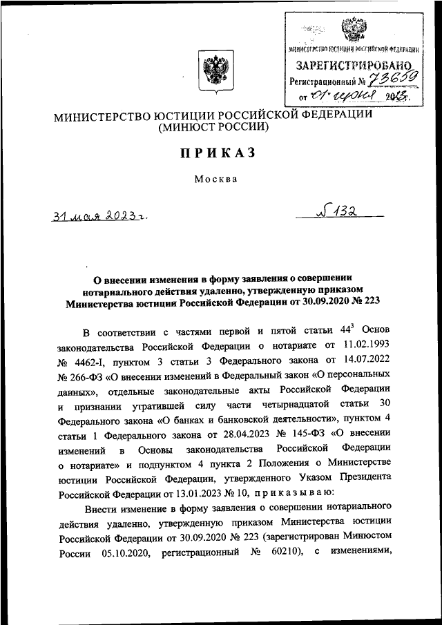 ПРИКАЗ Минюста РФ от 31.05.2023 N 132