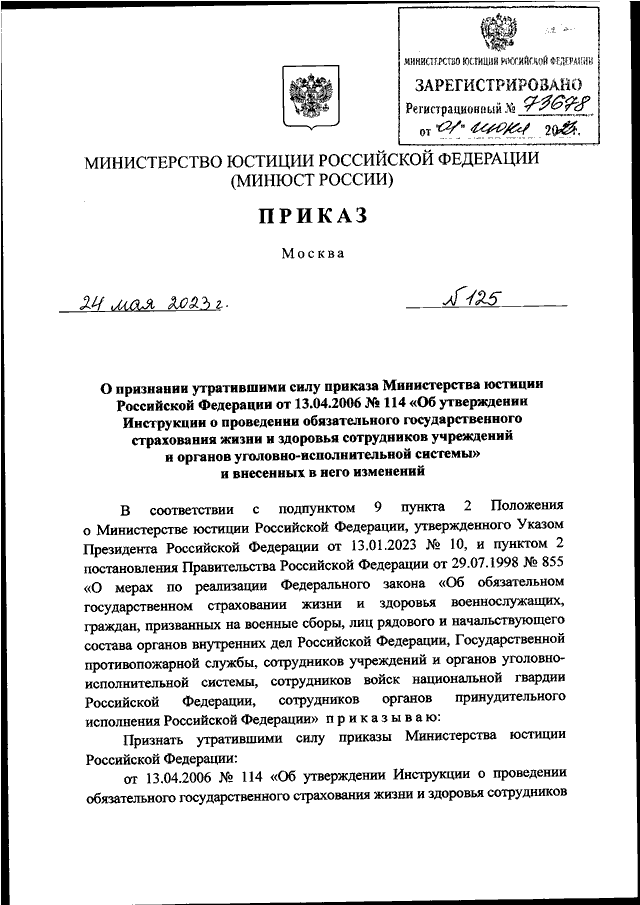 ПРИКАЗ Минюста РФ от 24.05.2023 N 125