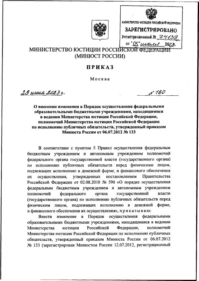 ПРИКАЗ Минюста РФ от 29.06.2023 N 160