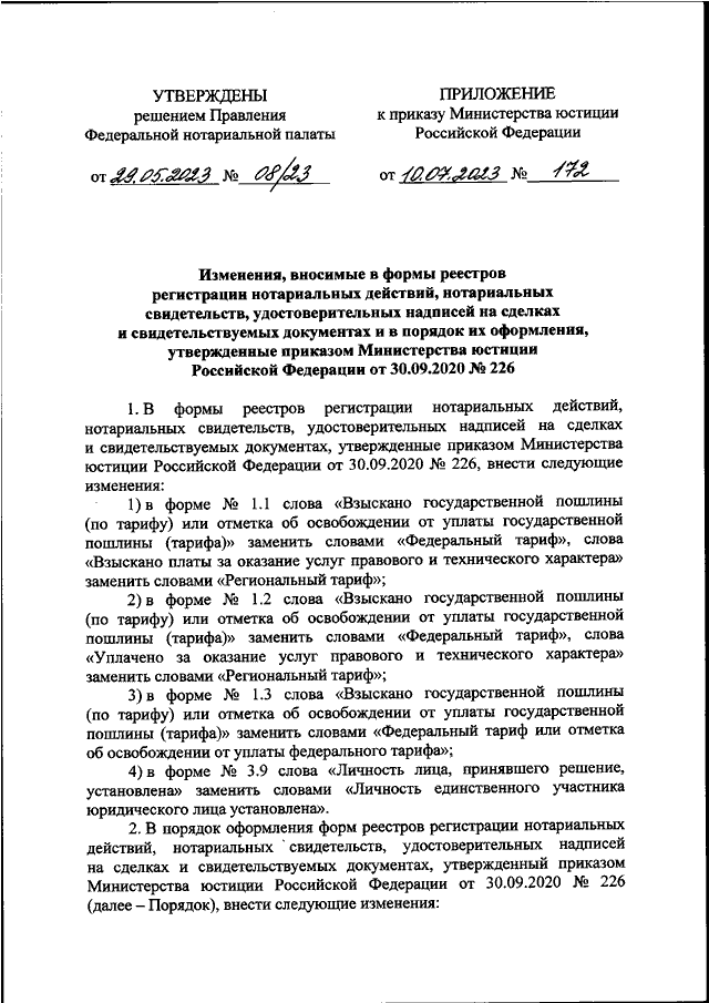 "О ВНЕСЕНИИ ИЗМЕНЕНИЙ В ФОРМЫ РЕЕСТРОВ РЕГИСТРАЦИИ НОТАРИАЛЬНЫХ ДЕЙСТВИЙ, НОТАРИАЛЬНЫХ СВИДЕТЕЛЬСТВ, УДОСТОВЕРИТЕЛЬНЫХ НАДПИСЕЙ НА СДЕЛКАХ И СВИДЕТЕЛЬСТВУЕМЫХ ДОКУМЕНТАХ И В ПОРЯДОК ИХ ОФОРМЛЕНИЯ, УТВЕРЖДЕННЫЕ ПРИКАЗОМ МИНИСТЕРСТВА ЮСТИЦИИ РОССИЙСКОЙ ФЕДЕРАЦИИ ОТ 30.09.2020 N 226"