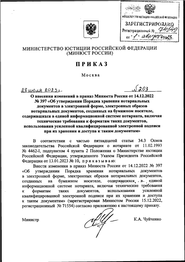 ПРИКАЗ Минюста РФ от 28.07.2023 N 203