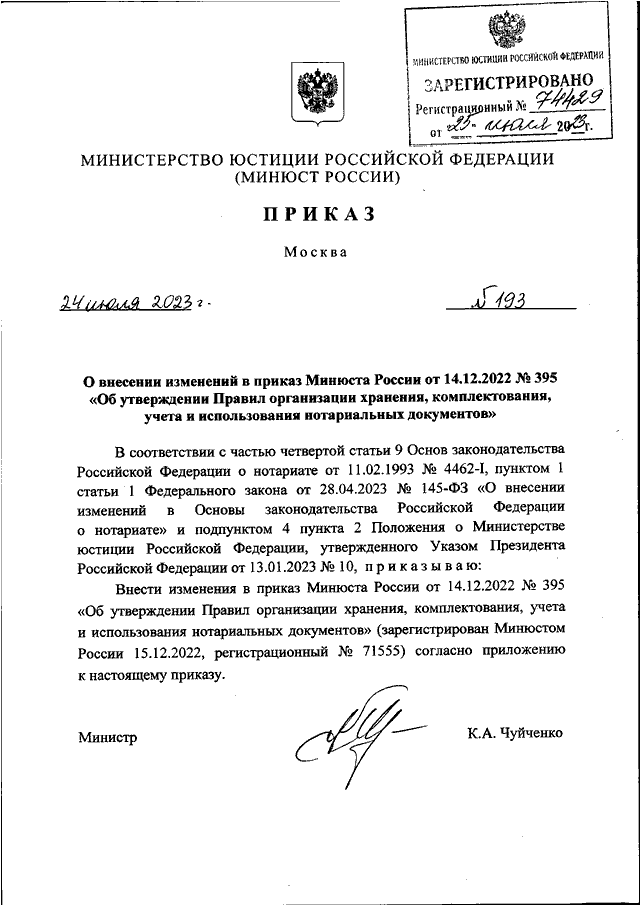 ПРИКАЗ Минюста РФ от 24.07.2023 N 193