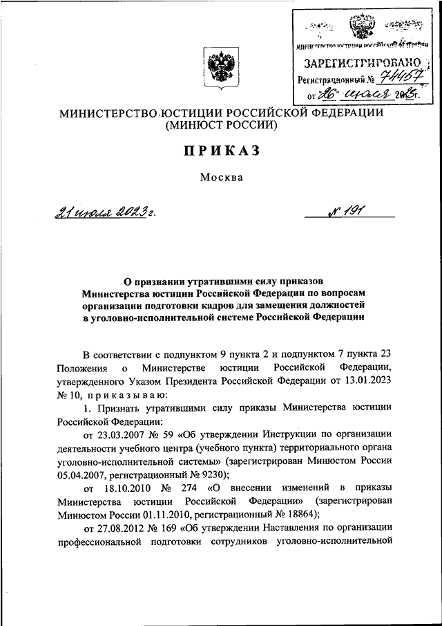 ПРИКАЗ Минюста РФ от 21.07.2023 N 191