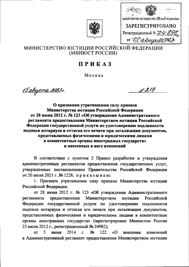 ПРИКАЗ Минюста РФ от 15.08.2023 N 219