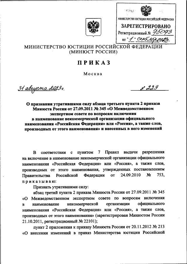 ПРИКАЗ Минюста РФ от 31.08.2023 N 229