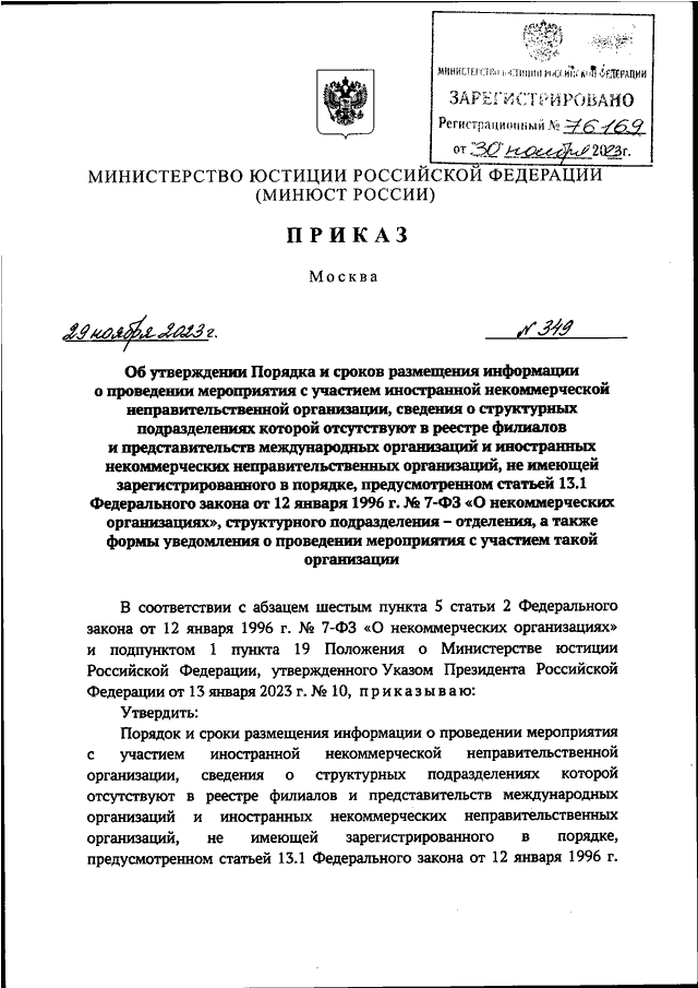ПРИКАЗ Минюста РФ от 29.11.2023 N 349