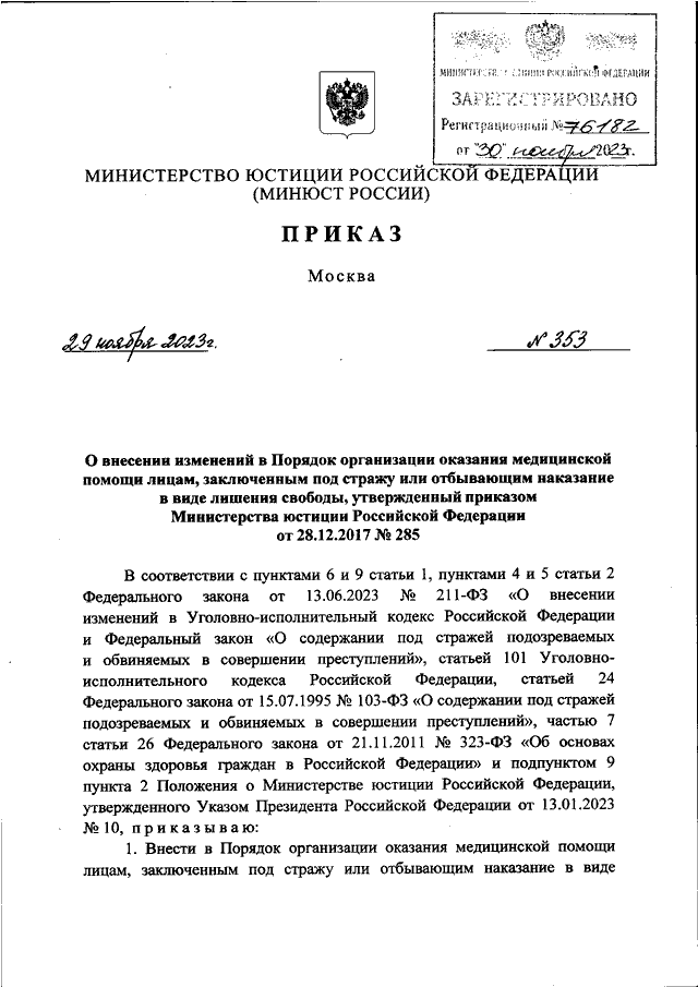 ПРИКАЗ Минюста РФ от 29.11.2023 N 353