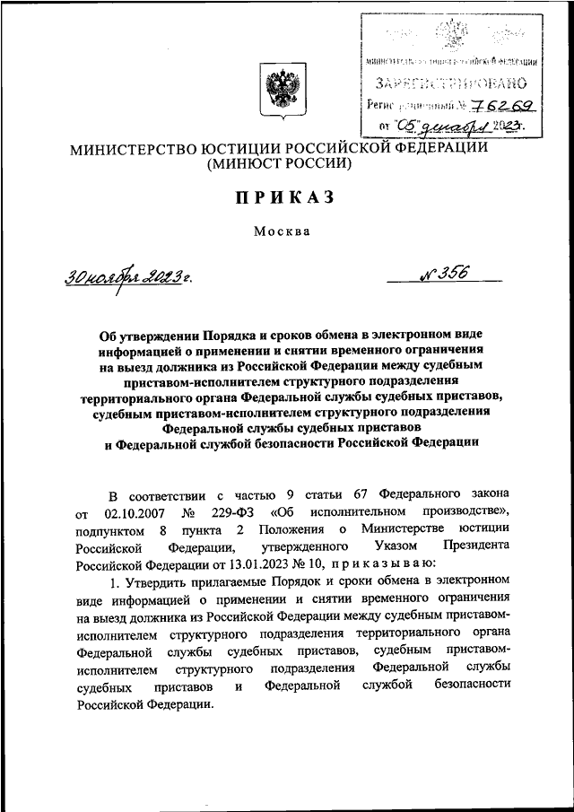 ПРИКАЗ Минюста РФ от 30.11.2023 N 356