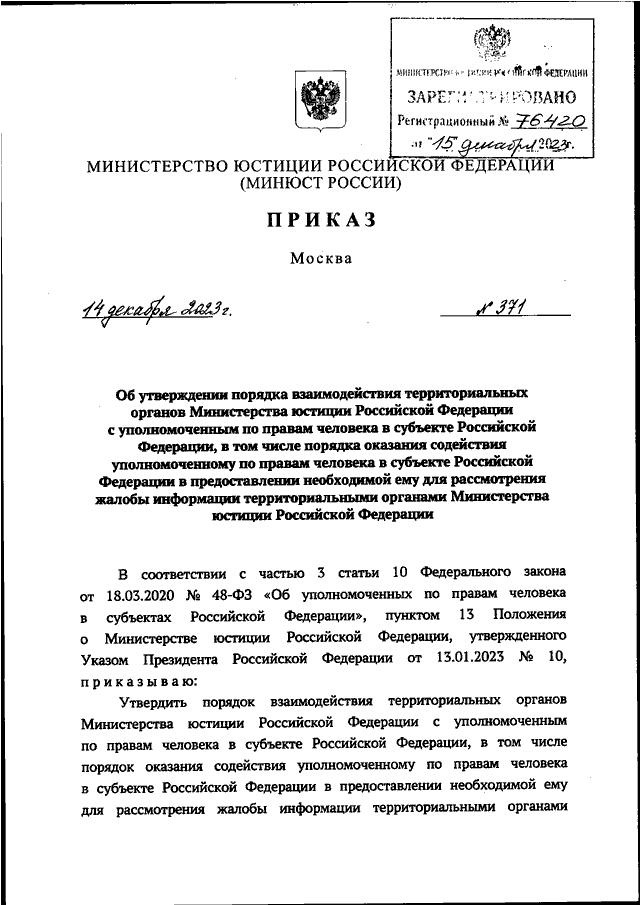 ПРИКАЗ Минюста РФ от 14.12.2023 N 371