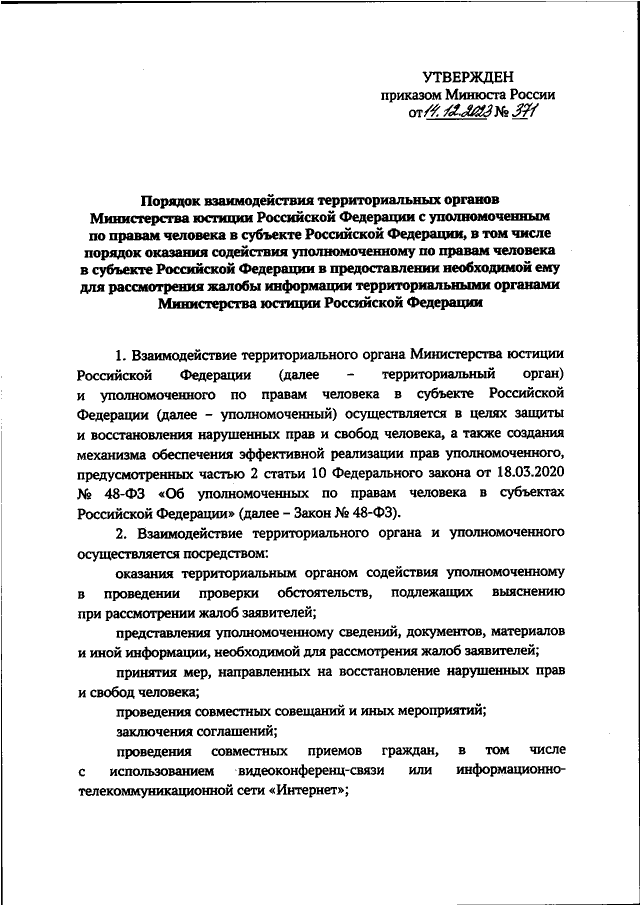 ПРИКАЗ Минюста РФ от 14.12.2023 N 371