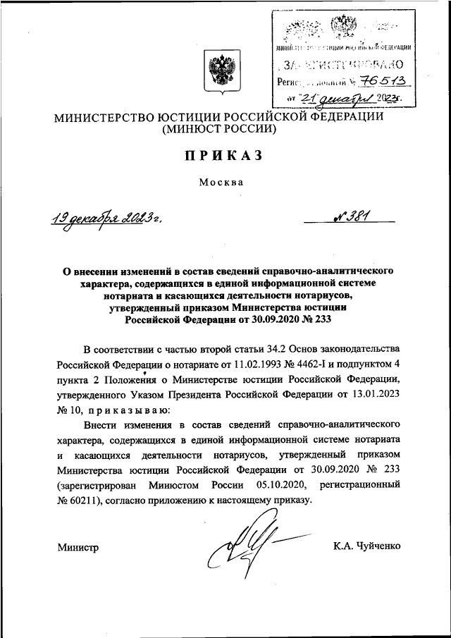 ПРИКАЗ Минюста РФ от 19.12.2023 N 381
