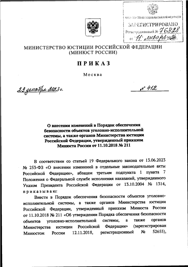 ПРИКАЗ Минюста РФ от 29.12.2023 N 412