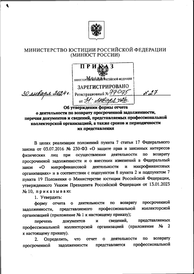 ПРИКАЗ Минюста РФ от 30.01.2024 N 27