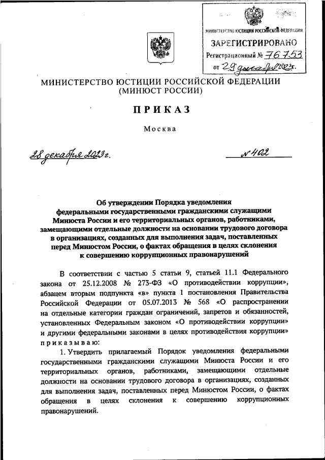ПРИКАЗ Минюста РФ от 28.12.2023 N 402