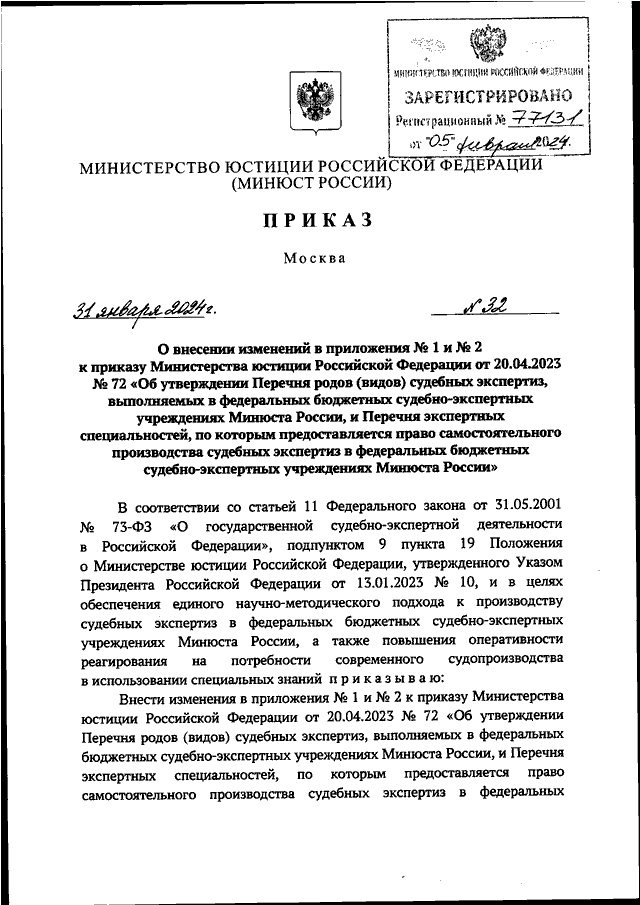 ПРИКАЗ Минюста РФ от 31.01.2024 N 32
