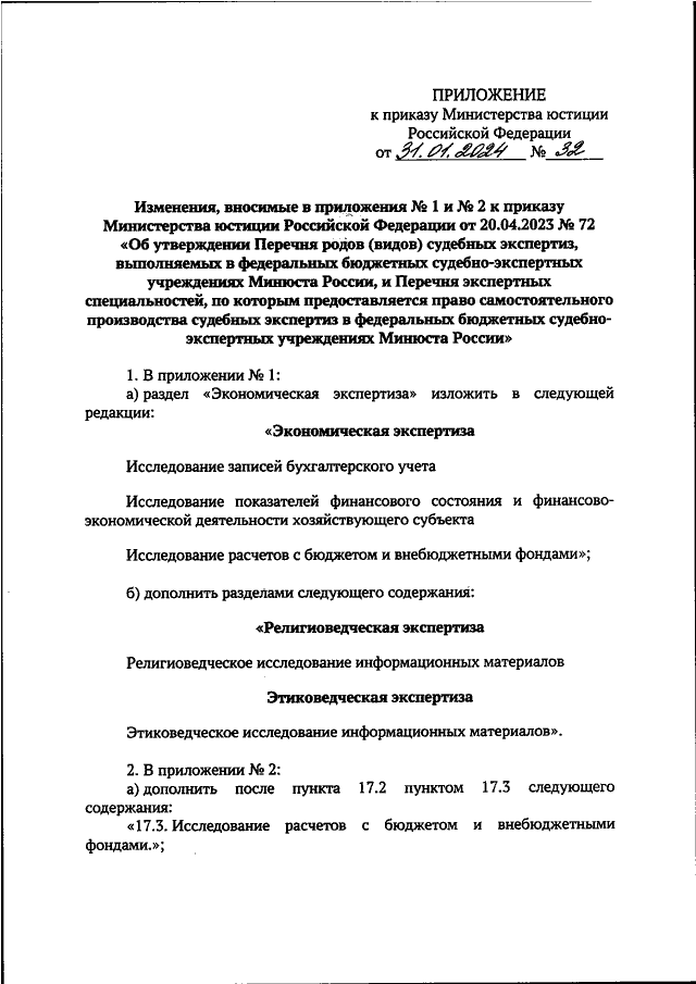 "О ВНЕСЕНИИ ИЗМЕНЕНИЙ В ПРИЛОЖЕНИЯ N 1 И N 2 К ПРИКАЗУ МИНИСТЕРСТВА ЮСТИЦИИ РОССИЙСКОЙ ФЕДЕРАЦИИ ОТ 20.04.2023 N 72 "ОБ УТВЕРЖДЕНИИ ПЕРЕЧНЯ РОДОВ (ВИДОВ) СУДЕБНЫХ ЭКСПЕРТИЗ, ВЫПОЛНЯЕМЫХ В ФЕДЕРАЛЬНЫХ БЮДЖЕТНЫХ СУДЕБНО - ЭКСПЕРТНЫХ УЧРЕЖДЕНИЯХ МИНЮСТА РОССИИ, И ПЕРЕЧНЯ ЭКСПЕРТНЫХ СПЕЦИАЛЬНОСТЕЙ, ПО КОТОРЫМ ПРЕДОСТАВЛЯЕТСЯ ПРАВО САМОСТОЯТЕЛЬНОГО ПРОИЗВОДСТВА СУДЕБНЫХ ЭКСПЕРТИЗ В ФЕДЕРАЛЬНЫХ БЮДЖЕТНЫХ СУДЕБНО - ЭКСПЕРТНЫХ УЧРЕЖДЕНИЯХ МИНЮСТА РОССИИ"