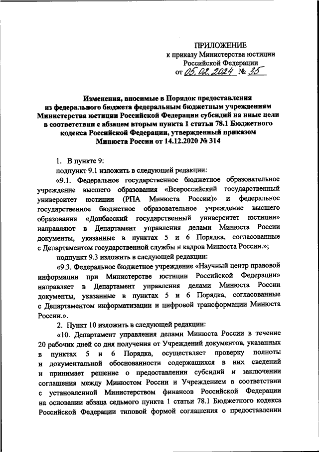 ПРИКАЗ Минюста РФ от 05.02.2024 N 35