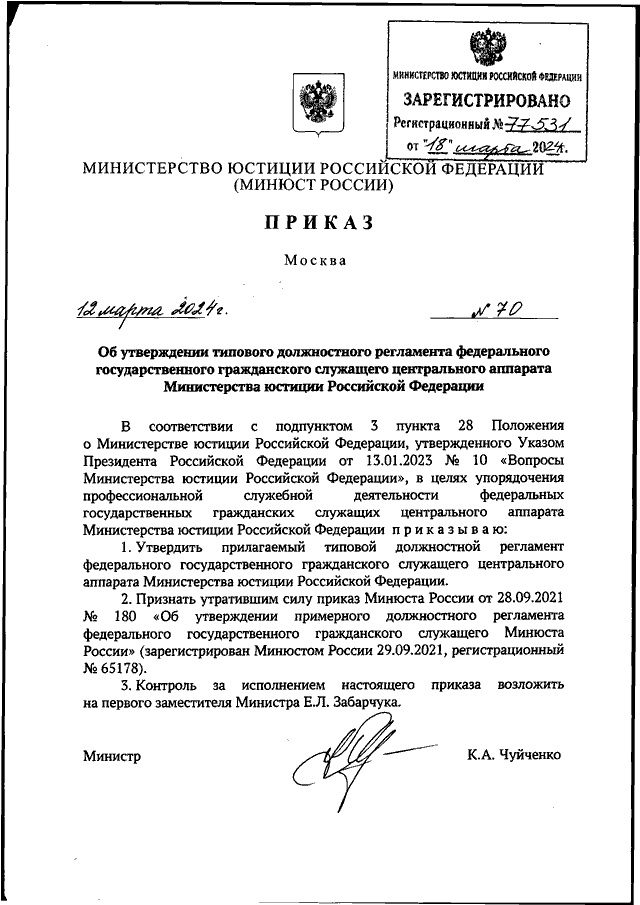 ПРИКАЗ Минюста РФ от 12.03.2024 N 70