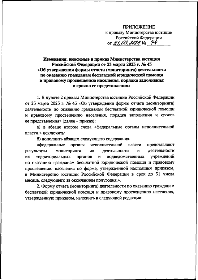 "О ВНЕСЕНИИ ИЗМЕНЕНИЙ В ПРИКАЗ МИНИСТЕРСТВА ЮСТИЦИИ РОССИЙСКОЙ ФЕДЕРАЦИИ ОТ 23 МАРТА 2023 Г. N 43 "ОБ УТВЕРЖДЕНИИ ФОРМЫ ОТЧЕТА (МОНИТОРИНГА) ДЕЯТЕЛЬНОСТИ ПО ОКАЗАНИЮ ГРАЖДАНАМ БЕСПЛАТНОЙ ЮРИДИЧЕСКОЙ ПОМОЩИ И ПРАВОВОМУ ПРОСВЕЩЕНИЮ НАСЕЛЕНИЯ, ПОРЯДКА ЗАПОЛНЕНИЯ И СРОКОВ ЕЕ ПРЕДСТАВЛЕНИЯ"