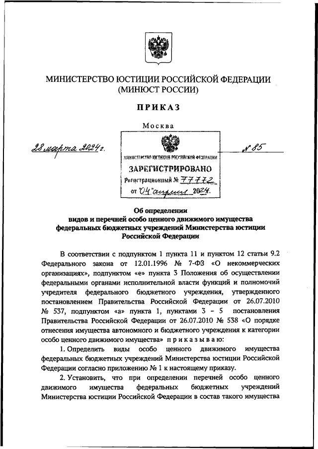 ПРИКАЗ Минюста РФ от 28.03.2024 N 85