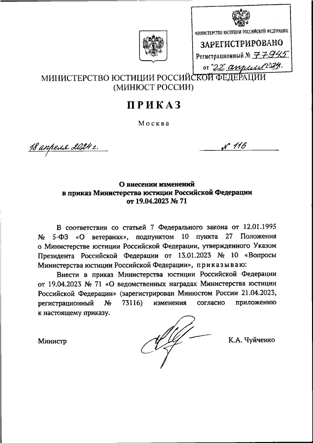 ПРИКАЗ Минюста РФ от 18.04.2024 N 116