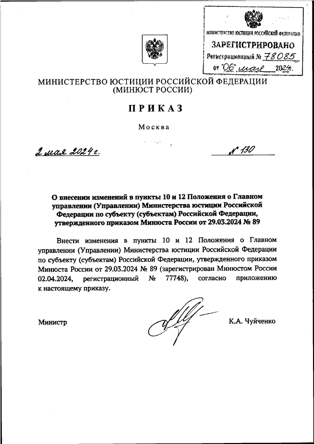 ПРИКАЗ Минюста РФ от 02.05.2024 N 130