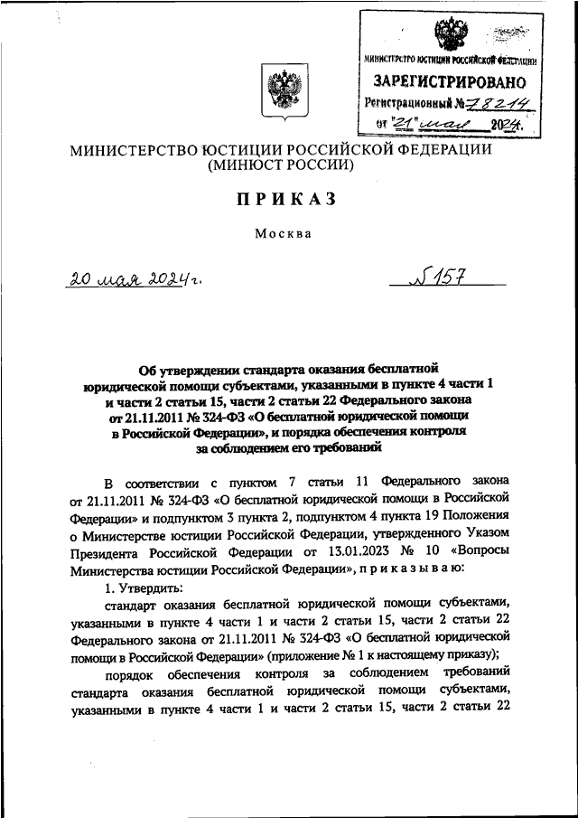 ПРИКАЗ Минюста РФ от 20.05.2024 N 157