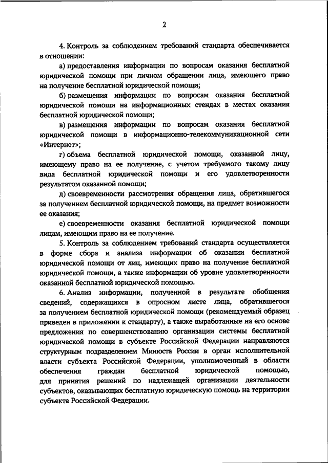 "ОБ УТВЕРЖДЕНИИ СТАНДАРТА ОКАЗАНИЯ БЕСПЛАТНОЙ ЮРИДИЧЕСКОЙ ПОМОЩИ СУБЪЕКТАМИ, УКАЗАННЫМИ В ПУНКТЕ 4 ЧАСТИ 1 И ЧАСТИ 2 СТАТЬИ 15, ЧАСТИ 2 СТАТЬИ 22 ФЕДЕРАЛЬНОГО ЗАКОНА ОТ 21.11.2011 N 324-ФЗ "О БЕСПЛАТНОЙ ЮРИДИЧЕСКОЙ ПОМОЩИ В РОССИЙСКОЙ ФЕДЕРАЦИИ", И ПОРЯДКА ОБЕСПЕЧЕНИЯ КОНТРОЛЯ ЗА СОВПАДЕНИЕМ ЕГО ТРЕБОВАНИЙ"