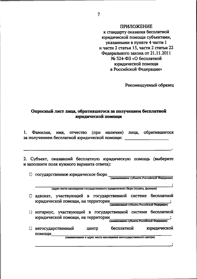 "ОБ УТВЕРЖДЕНИИ СТАНДАРТА ОКАЗАНИЯ БЕСПЛАТНОЙ ЮРИДИЧЕСКОЙ ПОМОЩИ СУБЪЕКТАМИ, УКАЗАННЫМИ В ПУНКТЕ 4 ЧАСТИ 1 И ЧАСТИ 2 СТАТЬИ 15, ЧАСТИ 2 СТАТЬИ 22 ФЕДЕРАЛЬНОГО ЗАКОНА ОТ 21.11.2011 N 324-ФЗ "О БЕСПЛАТНОЙ ЮРИДИЧЕСКОЙ ПОМОЩИ В РОССИЙСКОЙ ФЕДЕРАЦИИ", И ПОРЯДКА ОБЕСПЕЧЕНИЯ КОНТРОЛЯ ЗА СОВПАДЕНИЕМ ЕГО ТРЕБОВАНИЙ"