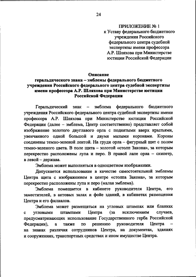 "ОБ УТВЕРЖДЕНИИ УСТАВА ФЕДЕРАЛЬНОГО БЮДЖЕТНОГО УЧРЕЖДЕНИЯ РОССИЙСКОГО ФЕДЕРАЛЬНОГО ЦЕНТРА СУДЕБНОЙ ЭКСПЕРТИЗЫ ИМЕНИ ПРОФЕССОРА А.Р. ШЛЯХОВА ПРИ МИНИСТЕРСТВЕ ЮСТИЦИИ РОССИЙСКОЙ ФЕДЕРАЦИИ"